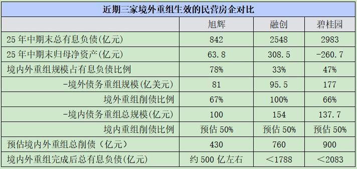 尤其是龙头房企在化债方面已经取得成效,多数民营房企通过削债方式的重组,大幅减轻了债务端的压力。比如,就碧桂园、融创、旭辉三家大型民营房企对比来看,在境外债方面,融创的削债比例最高,由于其重组方案为全额债转股,其削债比例也达到了100%;此外,碧桂园、旭辉的境外债削债比例分别约为66%和67%。在境内债方面,三家房企都削减了约50%的债务。